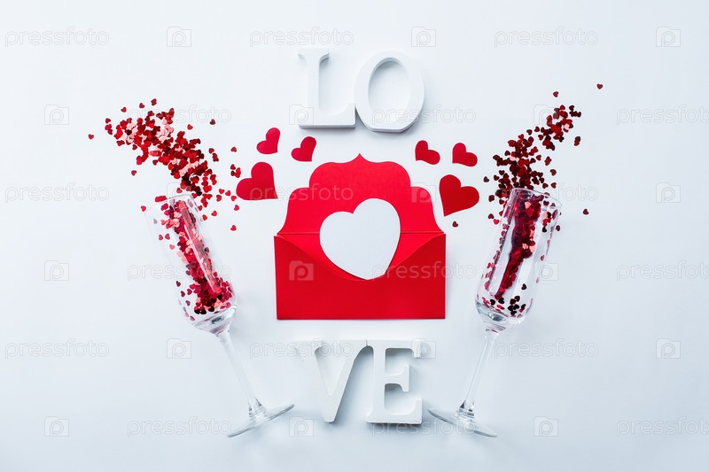 Бокалы для шампанского, любовное письмо и слово любовь на белом фоне вид сверху. День святого Валентина фон