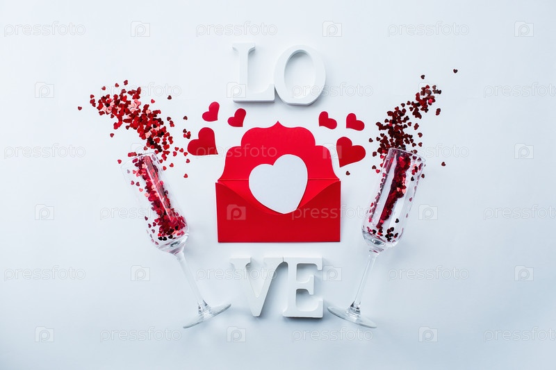 Бокалы для шампанского, любовное письмо и слово любовь на белом фоне вид сверху. День святого Валентина фон
