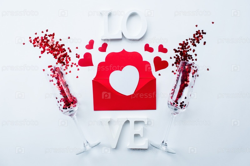 Бокалы для шампанского, любовное письмо и слово любовь на белом фоне вид сверху. День святого Валентина фон