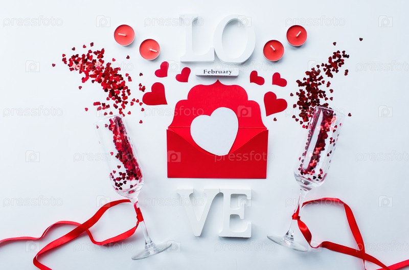 Бокалы для шампанского, любовное письмо и слово любовь на белом фоне вид сверху. День святого Валентина фон