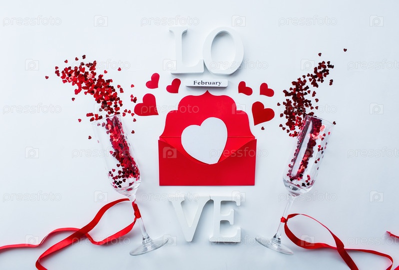 Бокалы для шампанского, любовное письмо и слово любовь на белом фоне вид сверху. День святого Валентина фон