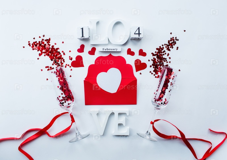 Бокалы для шампанского, любовное письмо и слово любовь на белом фоне вид сверху. День святого Валентина фон