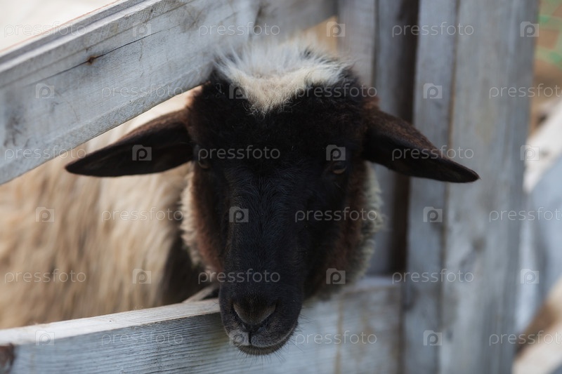 Скот. Овца в загоне. Концепция животноводства и сельской жизни. Портрет овец на свежем воздухе. Крупный план. Домашнее животное на частной эко ферме. Сельскохозяйственная промышленность