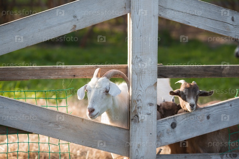 Скот. козы в загоне. Концепция животноводства и сельской жизни. Портрет улыбающейся козы на свежем воздухе. Крупный план. Домашнее животное на частной эко ферме. Сельскохозяйственная промышленность