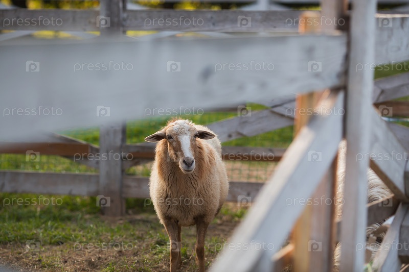 Скот. Овца в загоне. Концепция животноводства и сельской жизни. Портрет овец на свежем воздухе. Крупный план. Домашнее животное на частной эко ферме. Сельскохозяйственная промышленность