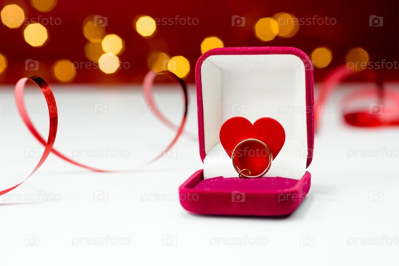 Золотое кольцо, обручальное кольцо в красной коробке и красное сердце на бело-красном фоне с красивым боке. Момент свадьбы, юбилея, помолвки или Дня святого Валентина. Счастливый день