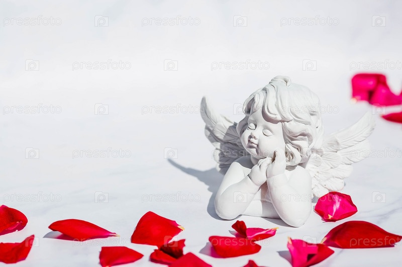 Милый ангел и лепестки красной розы на фоне белого мрамора. Тема любви. День Святого Валентина. Открытка к празднику