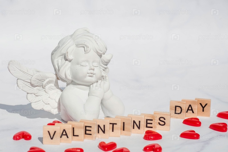Слово «День святого Валентина» и милый ангел на белом мраморном фоне. Любовь на деревянных кубиках. Тема любви. День Святого Валентина. Деревянные блоки со словом любовь. Положительные эмоции