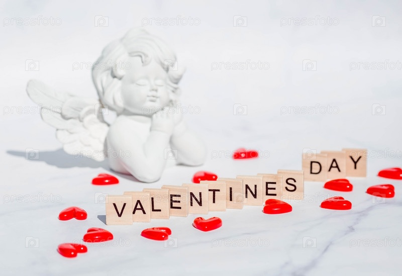 Слово «День святого Валентина» и милый ангел на белом мраморном фоне. Любовь на деревянных кубиках. Тема любви. День Святого Валентина. Деревянные блоки со словом любовь. Положительные эмоции
