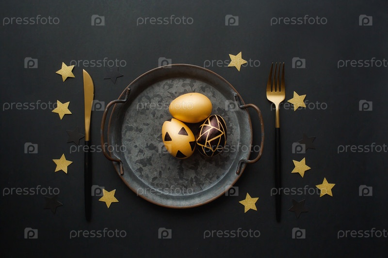 Яйцо золотое на черном фоне. Минимальная концепция. Тарелка, нож, вилка. Вид сверху. Карточка с местом для копирования текста