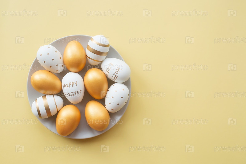 Золотые пасхальные яйца на круглой тарелке на желтом фоне. Модная плоская планировка на пасху. Минимальная концепция