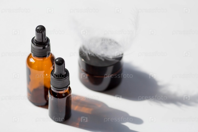 Макет брендинга салона красоты. Стеклянная бутылка-капельница и ручка в солнечный день на белом фоне. Натуральная органическая экокосметика