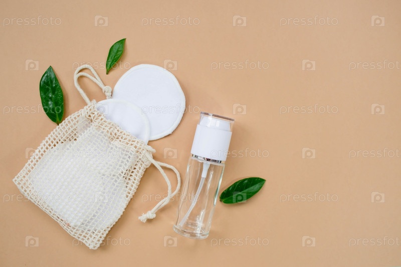 Контейнер с лосьоном, многоразовые ватные диски в хлопчатобумажной сумке на бежевом фоне, вид сверху. Натуральная органическая эко косметика. Макет брендинга салона красоты