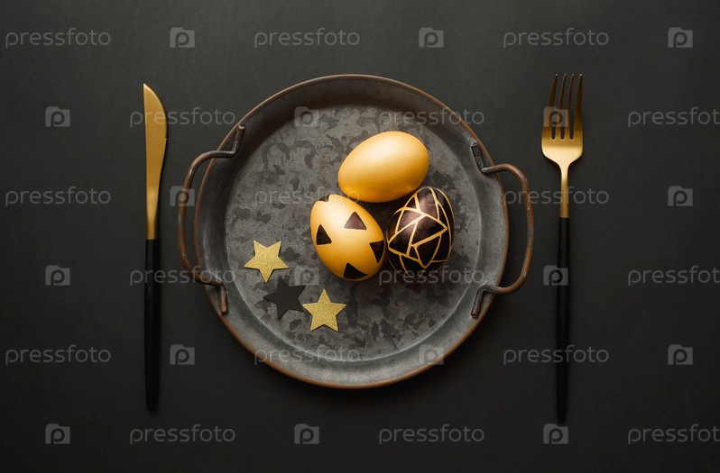 Яйцо золотое на черном фоне. Минимальная концепция. Тарелка, нож, вилка. Вид сверху. Карточка с местом для копирования текста