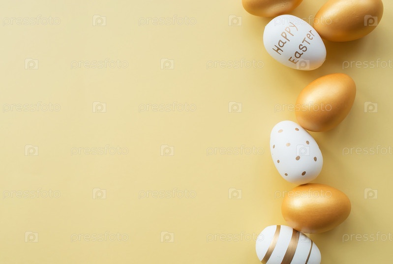 Золотые пасхальные яйца копируют пространство для текста на желтом фоне. Модная плоская планировка на пасху. Минимальная концепция