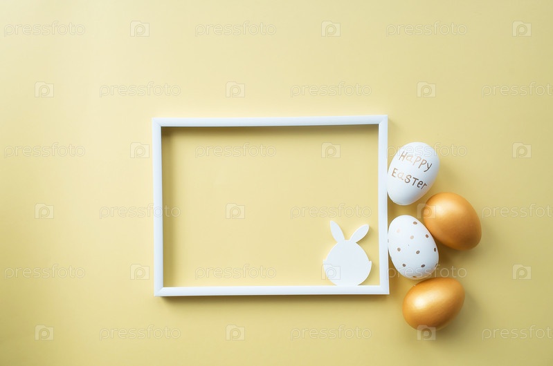 Золотые пасхальные яйца с белой рамкой для текста на желтом фоне. Модная плоская планировка на пасху. Минимальная пасхальная концепция