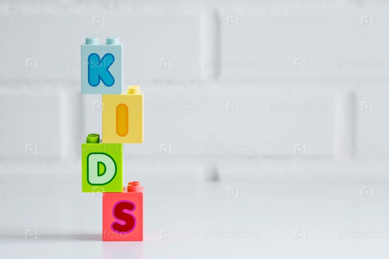 Слово дети из конструктора на белом фоне. Детские развивающие логические игрушки используются в играх Монтессори для развития