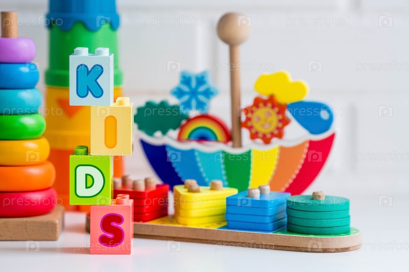 Слово дети из конструктора на белом фоне. Детские развивающие логические игрушки используются в играх Монтессори для развития