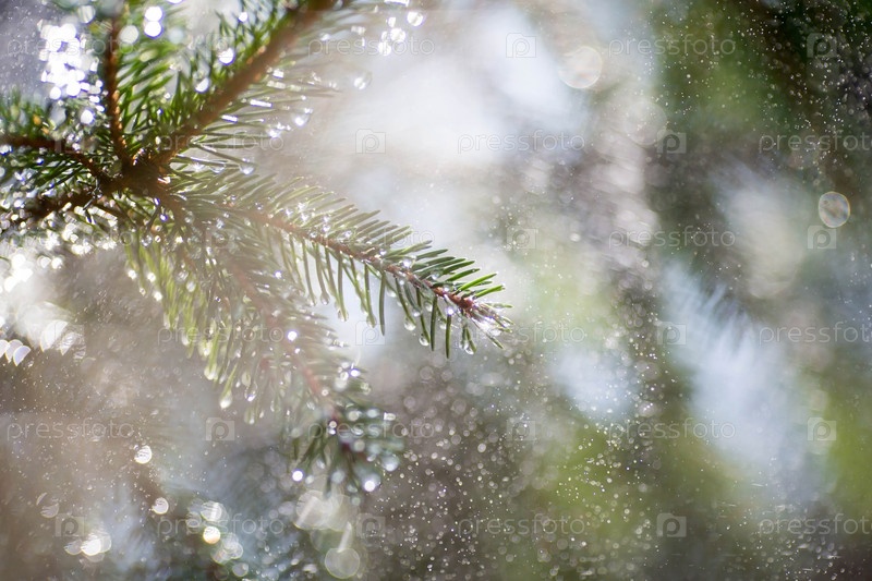 Весна, природа обои. Молодая еловая ветка крупным планом. Капли дождя блестят на хвое на солнце. Дерево или куст. Размытый фон