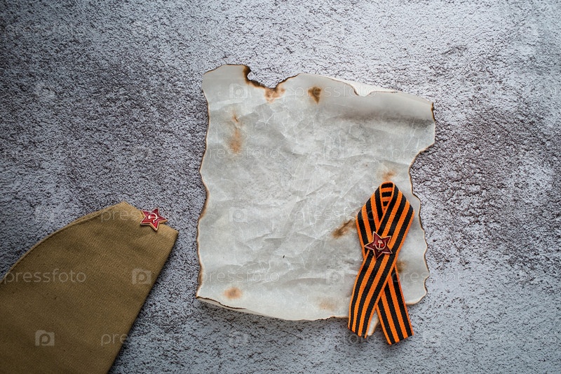 Праздник 9 мая. Георгиевская ленточка, колпак и мятая жженая бумага для заметок на фоне бетона. Концепция Великой Победы или Дня защитника Отечества. Вид сверху, пространство для копирования