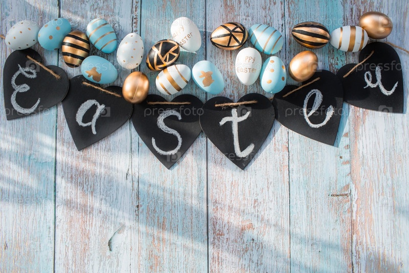 Золотые, черные, белые, синие яйца в авоське на синем деревянном фоне. Геометрия. Минимальная концепция. Вид сверху. Пасхальная открытка с копией места для текста