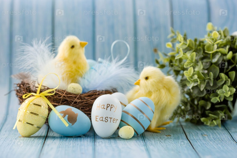 Синие, желтые, белые яйца в гнезде и желтые цыплята на синем деревянном фоне. Минимальная концепция. Пасхальная открытка с копией места для текста