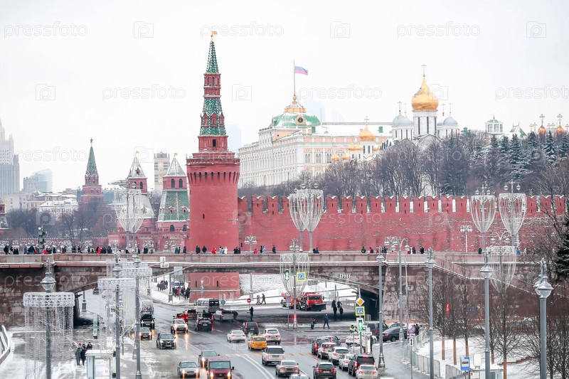 Вид Москвы в зимний день. столица России. Большой Кремлевский Дворец. Кремлевская церковь. Кремлевская набережная. Москва-река. Популярная туристическая достопримечательность. Визитная карточка Москвы