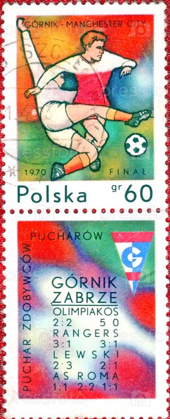 Польша, около 1966 года: Почтовая марка с изображением футболистов и надписью "Горник Забже, финалист Кубка обладателей кубков, 1970", из серии "Футбол"