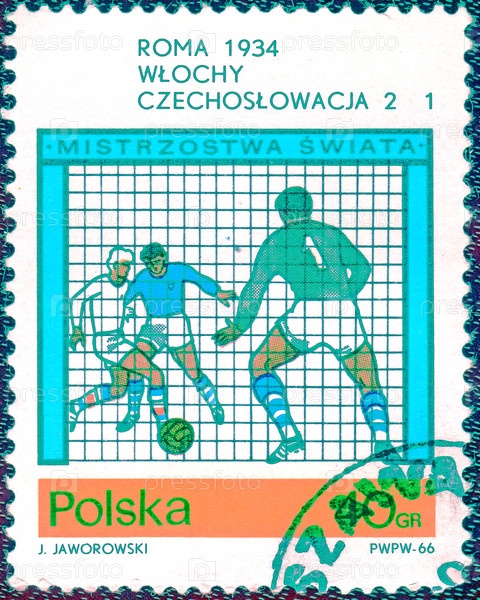 Польша, около 1966 года: Почтовая марка с изображением футболистов и надписью "Рим 1934, финал Италия-Чехословакия 2: 1", из серии "История футбола"