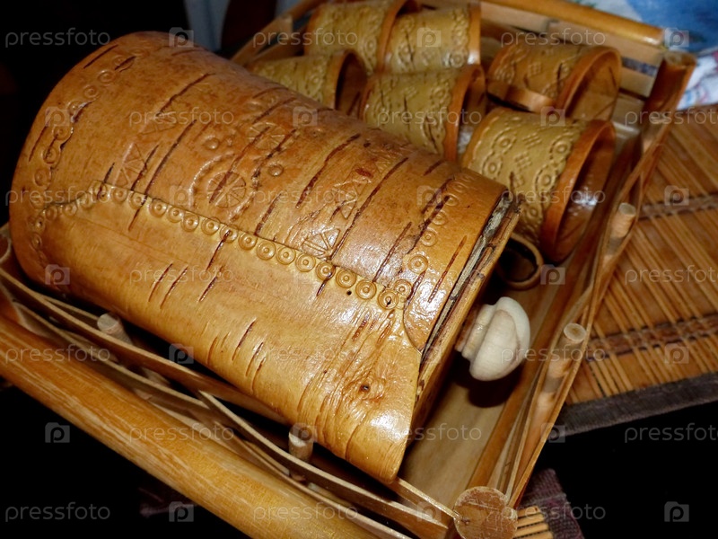 Чайник и чашки из бересты. Кухонные принадлежности. Народные промыслы России. Ретро. Изделия из бересты изготавливались большинством обществ задолго до того, как была изобретена керамика