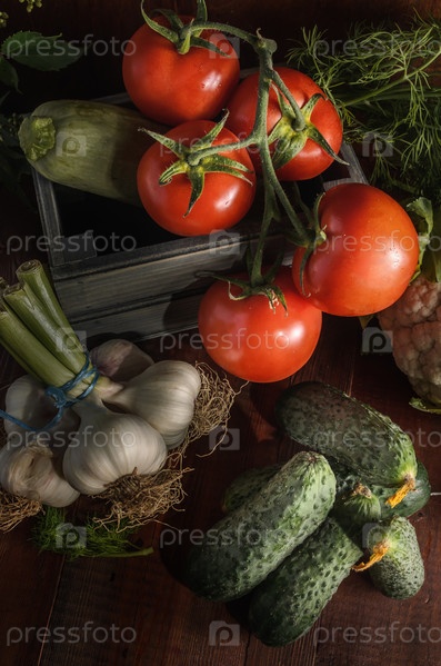Спелые овощи на темном деревянном фоне в деревенском стиле