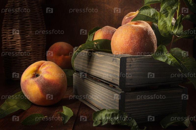 Персики в деревянной коробке на темном деревянном фоне в деревенском стиле
