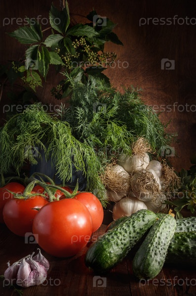 Спелые овощи на темном деревянном фоне в деревенском стиле