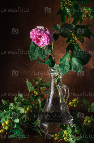 Цветок шиповника в кувшине на темном деревянном фоне в деревенском стиле