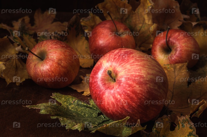 Яблоки оптом на темном деревянном фоне в деревенском стиле