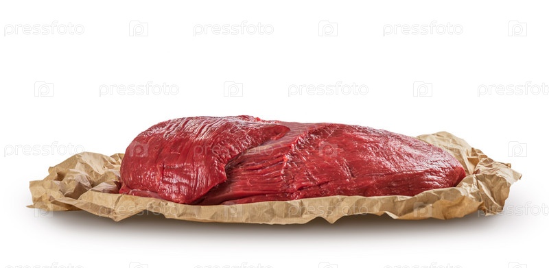 Кусок свежего сырого говяжьего мяса на крафт-бумаге. Изолированные на белом фоне с мягкой тенью