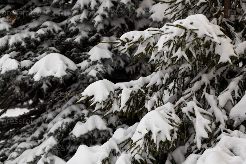 Первый снег на еловой ветке крупным планом. снежные шапки на ветвях ели. новогодний фон для дизайна