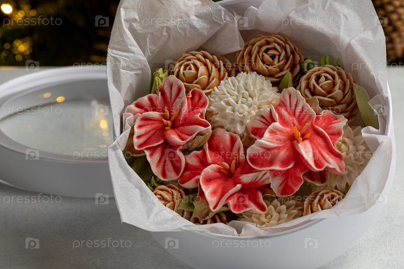 Зефирный букет цветов в подарочной коробке на светлом фоне. концепция новогоднего праздника. Зефир с минимальным количеством сахара. натуральный продукт