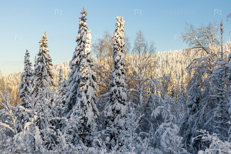 Заснеженный лес в тайге в зимний день. красивый пейзаж зимнего хвойного леса. заснеженные ели