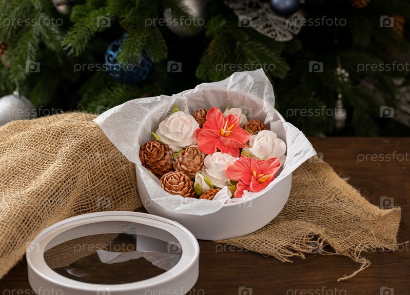 Зефирный букет цветов в подарочной коробке на фоне елки, концепция праздничного настроения