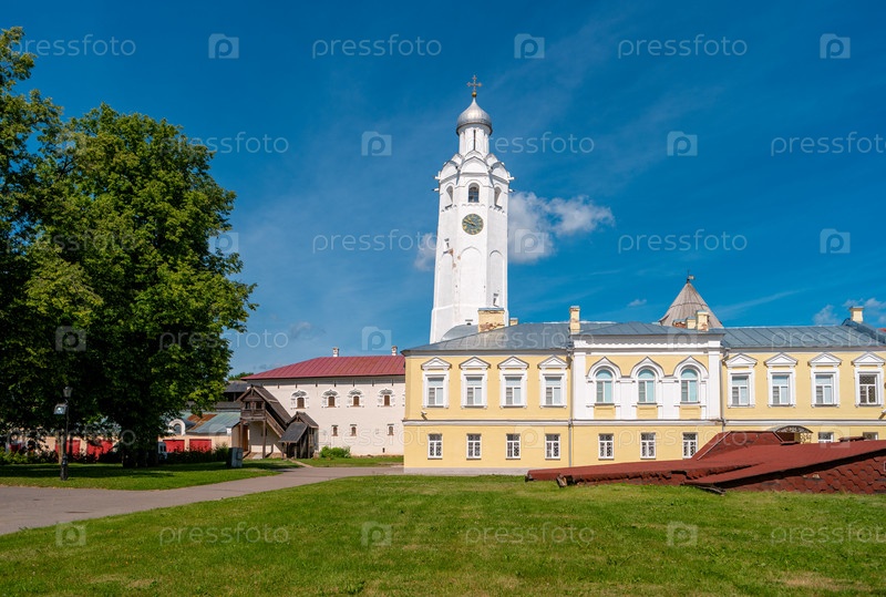 Часовая башня Новгородского Кремля. Церковь преподобного Сергия Радонежского на Владычном Дворе на территории Новгородского детинца