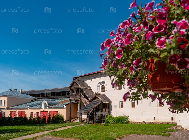 Вид корпуса Лихудова с деревянным крыльцом в Новгородском детинце. Старый Кремль в Великом Новгороде, Россия
