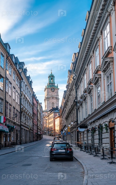 Европейская улица в историческом центре Гамла Стан с видом на колокольню собора Святого Николая (Сторкиркан) в утреннем свете. Стокгольм, Швеция