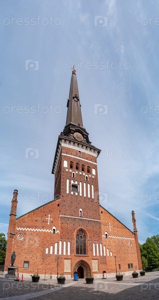 Вертикальная панорама с Вестеросским собором, Швеция. Осмотрите старую колокольню с часами