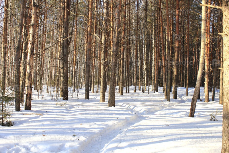 Дорога в зимнем лесу в солнечный день