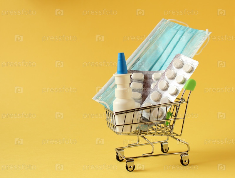 Тележка для продуктов крупным планом, полная лекарств на желтом фоне с копировальным пространством. Концепция здоровья