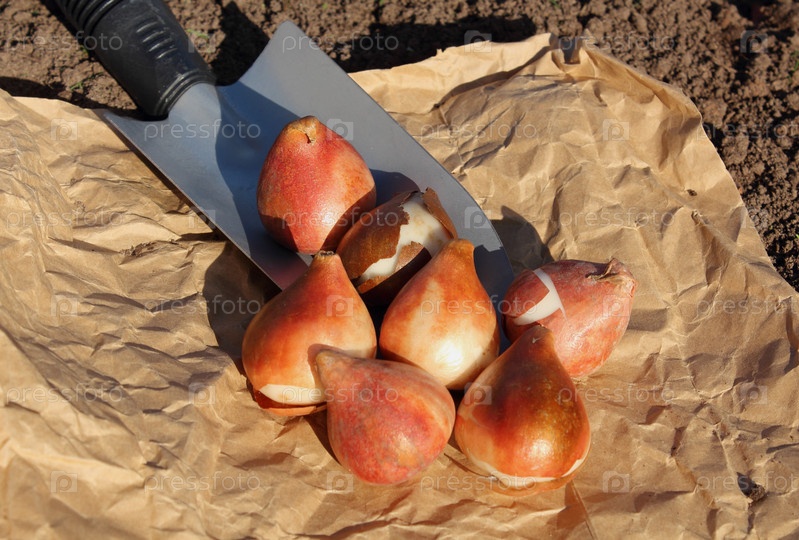 Луковицы тюльпанов и совок лежат на земле. Подготовка к посадке