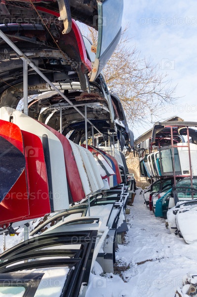 Продаются на запчасти разобранные автомобили на автосвалке. Стек дверей и бамперов. Торговля бывшими в употреблении запасными частями является обычным делом в развивающихся странах