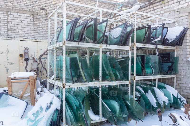 Металлические стеллажи с бывшими в употреблении лобовыми стеклами, снятыми с разобранных автомобилей для их дальнейшей продажи. Торговля бывшими в употреблении запасными частями является обычным делом в развивающихся странах