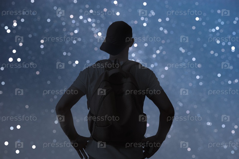 Мужчина стоит на холме, глядя на звездное ночное небо. Вид сзади. Звездное боке